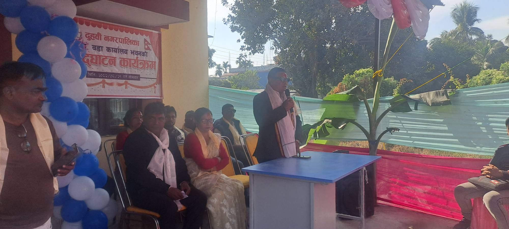 दुहवी वडा नं.५ मा रहेको लुनकरण दास गंगादेवी च्यारिटी अस्पतालको भवनलाई सदुपयोग गर्दै आज दुहवी नगरपालिकाको नगर प्रमुख वेद नारायण गच्छदारको प्रमुख आथित्यतामा वडा कार्यालय भवनको समुद््घटन गरिएको हो ।