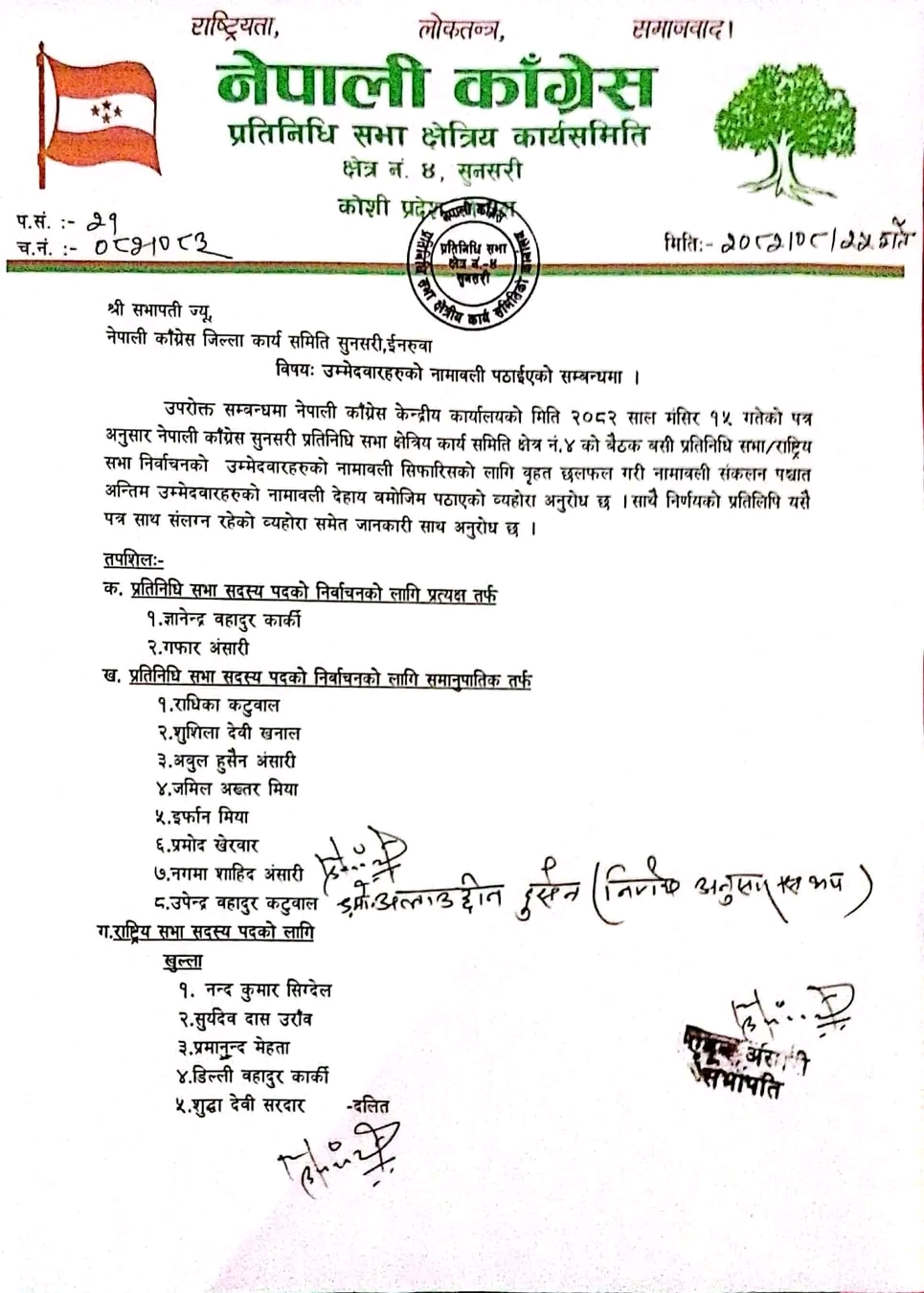 सुनसरी । सुनसरी क्षेत्र नं. ४ मा नेपाली कांग्रेसले गरेको उम्मेदवार सिफारिसले पार्टीभित्र विवाद चर्किएको छ। प्रत्यक्षतर्फ ज्ञानेन्द्र बहादुर कार्की र गफार अंसारीको नाम सिफारिस भएपछि स्थानीय कार्यकर्ता तथा नेतामाझ असन्तुष्टि बढेको छ।