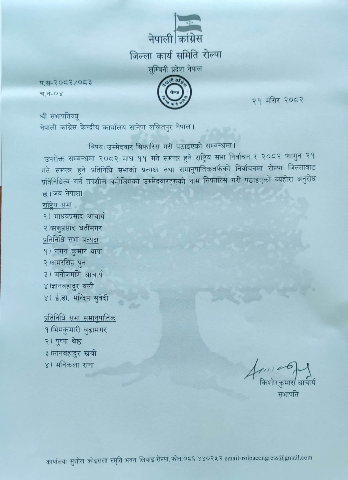 यसैक्रममा रोल्पा जिल्ला कार्य समितिले पनि आकांक्षीकाे टिकट सिफारिस गरि केन्द्रमा पठाएइको छ । यसरी सिफारिस पठाएको नामहरुमा युवा पुस्ताका चर्चित नेता एवम नेपाली काङ्गेसका महामन्त्री गगन कुमार थापालाई विषेश प्राथिमकताका साथ पहिलो नम्वरमा सिफारिस गरिएको छ ।