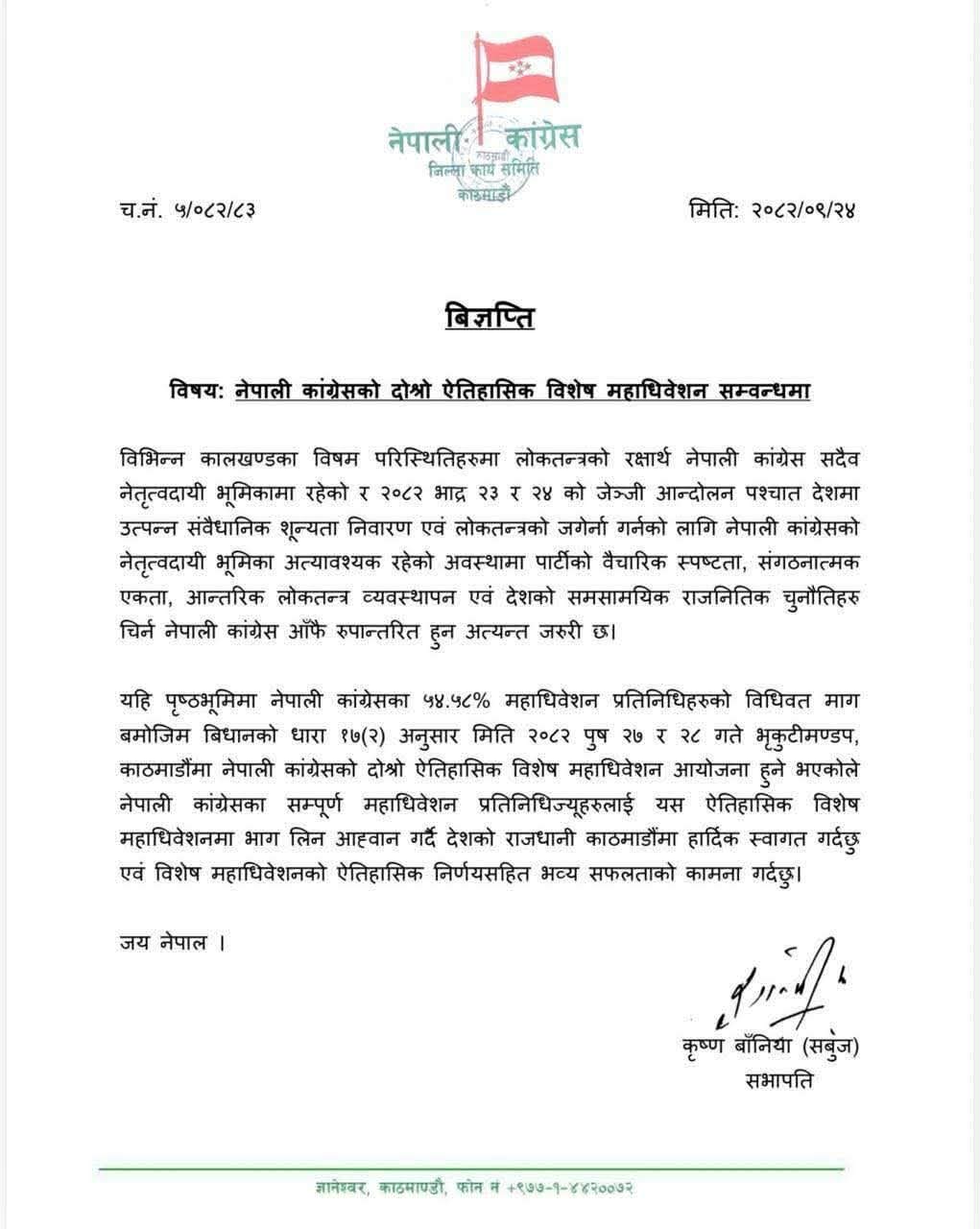 यसअघि नेपाली कांग्रेसका ५४ प्रतिशतभन्दा बढी महाधिवेशन प्रतिनिधिहरूले हस्ताक्षर संकलन गरी विशेष महाधिवेशनको माग गरेका थिए। उक्त मागलाई पार्टीका महामन्त्रीद्वय गगन थापा र विश्वप्रकाश शर्मालगायत नेताहरूले सार्वजनिक रूपमा समर्थन र अपनत्व जनाएका छन्। यद्यपि संस्थापन पक्षका केही नेताहरूले भने हस्ताक्षर फिर्ता गराउन अनुरोध गर्ने निर्णय गरेका छन्, जसले पार्टीभित्रको मतभेदलाई अझ सतहमा ल्याएको छ।